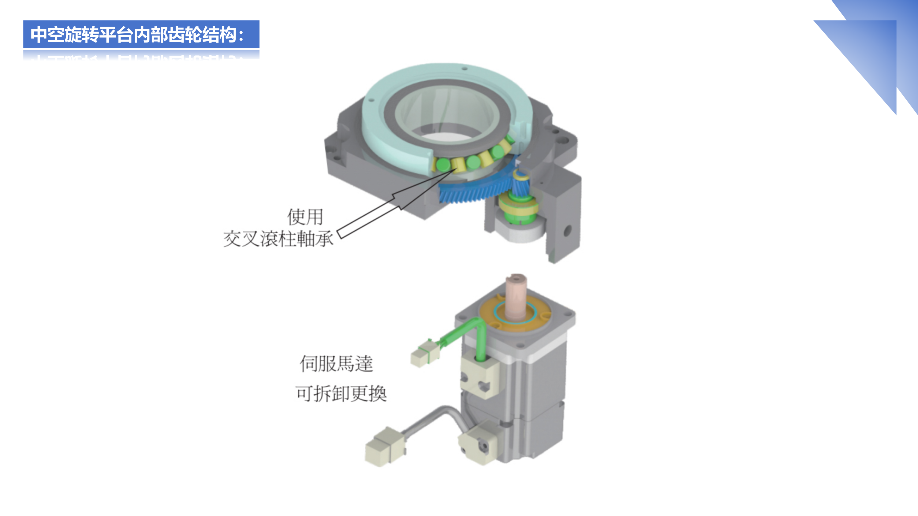 伺服旋转平台的转盘由一套精密交叉滚子轴承支撑,轴承中的滚子呈90度交错排列,并且滚子直径略大于轴承内圈与外圈间的滚道尺寸,使得交叉滚子轴承的内外圈及滚子之间存在预紧力,由此轴承支撑的伺服旋转平台转盘能够承受径向、轴向、倾覆等各种力矩,其刚性是传统轴承的10倍以上。