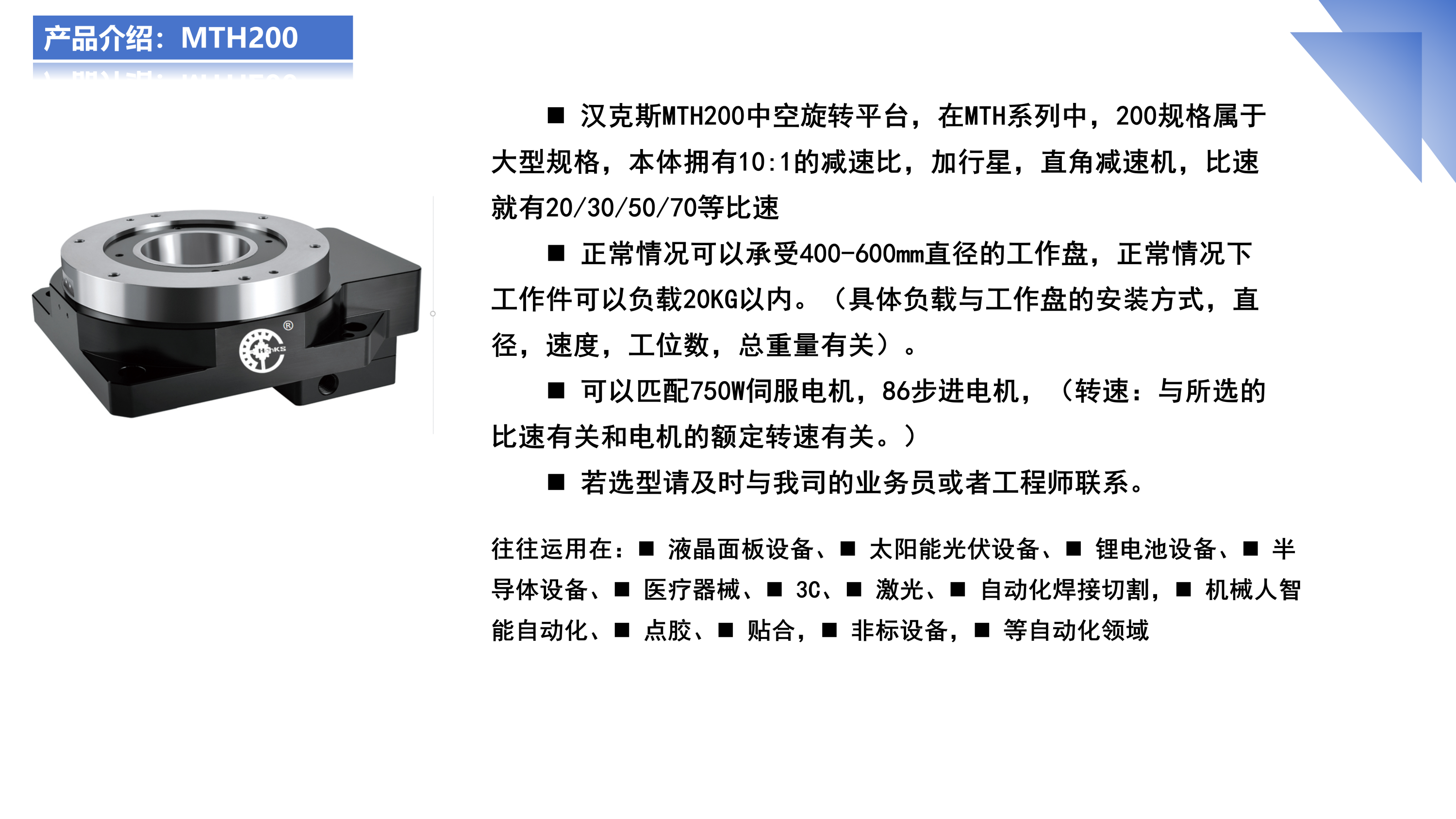 伺服旋转平台的转盘为中空结构,伺服电机连接在侧边,方便冶具中的气管、电线安装。